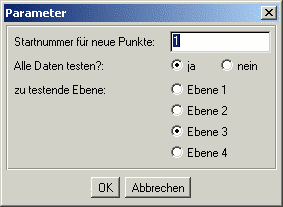 //Abfrage einer Ganzzahl $startNummer = new Gui LongField name = "Startnummer für neue Punkte" default = "1" end //Abfrage eines Wahrheitswertes $testAll = new Gui BooleanGroup name = "Alle Daten testen?" default = "true" end //Abfrage einer Zeichenkette $testEb = new Gui StringGroup name = "zu testende Ebene" value = Ebene 1 value = Ebene 2 value = Ebene 3 value = Ebene 4 default = Ebene 3 end
